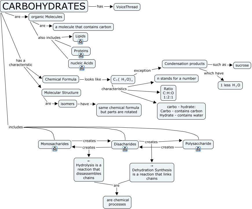 This Concept Map, created with IHMC CmapTools, has information related to: Carbohydrates, Condensation products which have <math xmlns="http://www.w3.org/1998/Math/MathML"> <mrow> <mtext> 1 less </mtext> <mmultiscripts> <mtext> H </mtext> <mtext> 2 </mtext> <none/> </mmultiscripts> <mtext> O </mtext> </mrow> </math>, <math xmlns="http://www.w3.org/1998/Math/MathML"> <mrow> <mmultiscripts> <mtext> C </mtext> <mtext> n </mtext> <none/> </mmultiscripts> <mmultiscripts> <mrow> <mtext> ( </mtext> <mmultiscripts> <mtext> H </mtext> <mtext> 2 </mtext> <none/> </mmultiscripts> <mtext> O) </mtext> </mrow> <mtext> n </mtext> <none/> </mmultiscripts> </mrow> </math> characteristics n stands for a number, organic Molecules also includes Proteins, Monosacharides creates Disacharides, Disacharides creates Polysaccharide, <math xmlns="http://www.w3.org/1998/Math/MathML"> <mrow> <mmultiscripts> <mtext> C </mtext> <mtext> n </mtext> <none/> </mmultiscripts> <mmultiscripts> <mrow> <mtext> ( </mtext> <mmultiscripts> <mtext> H </mtext> <mtext> 2 </mtext> <none/> </mmultiscripts> <mtext> O) </mtext> </mrow> <mtext> n </mtext> <none/> </mmultiscripts> </mrow> </math> characteristics carbo - hydrate: Carbo - contains carbon Hydrate - contains water, <math xmlns="http://www.w3.org/1998/Math/MathML"> <mrow> <mmultiscripts> <mtext> C </mtext> <mtext> n </mtext> <none/> </mmultiscripts> <mmultiscripts> <mrow> <mtext> ( </mtext> <mmultiscripts> <mtext> H </mtext> <mtext> 2 </mtext> <none/> </mmultiscripts> <mtext> O) </mtext> </mrow> <mtext> n </mtext> <none/> </mmultiscripts> </mrow> </math> exception Condensation products, CARBOHYDRATES has a characteristic Molecular Structure, → Dehydration Synthesis is a reaction that links chains are are chemical processes, Polysaccharide creates Disacharides, organic Molecules also includes nucleic Acids, <math xmlns="http://www.w3.org/1998/Math/MathML"> <mrow> <mmultiscripts> <mtext> C </mtext> <mtext> n </mtext> <none/> </mmultiscripts> <mmultiscripts> <mrow> <mtext> ( </mtext> <mmultiscripts> <mtext> H </mtext> <mtext> 2 </mtext> <none/> </mmultiscripts> <mtext> O) </mtext> </mrow> <mtext> n </mtext> <none/> </mmultiscripts> </mrow> </math> characteristics Ratio C:H:O 1:2:1, ← Hydrolysis is a reaction that dissassembles chains are are chemical processes, Molecular Structure are isomers, CARBOHYDRATES has a characteristic Chemical Formula, organic Molecules are a molecule that contains carbon, CARBOHYDRATES includes Polysaccharide, CARBOHYDRATES are organic Molecules, Disacharides creates → Dehydration Synthesis is a reaction that links chains, organic Molecules also includes Lipids