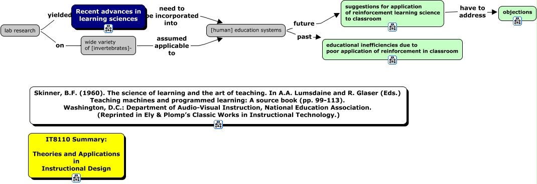 _main_Skinner_scienceLearningArtTeaching_1960, lab research yielded Recent advances in learning sciences, lab research on wide variety of [invertebrates]-, [human] education systems past educational inefficiencies due to poor application of reinforcement in classroom, wide variety of [invertebrates]- assumed applicable to [human] education systems, Recent advances in learning sciences need to be incorporated into [human] education systems, [human] education systems future suggestions for application of reinforcement learning science to classroom, suggestions for application of reinforcement learning science to classroom have to address objections