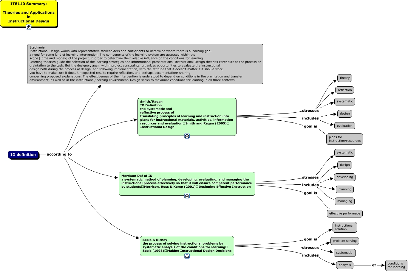 ID_definition_IT8110_ContentSummary, Smith/Ragan ID Definition the systematic and reflective process of translating principles of learning and instruction into plans for instructional materials, activities, information resources and evaluation Smith and Ragan (2005) Instructional Design includes design, Smith/Ragan ID Definition the systematic and reflective process of translating principles of learning and instruction into plans for instructional materials, activities, information resources and evaluation Smith and Ragan (2005) Instructional Design includes evaluation, ID definition according to Seels & Richey the process of solving instructional problems by systematic analysis of the conditions for learning Seels (1998) Making Instructional Design Decisions, analysis of conditions for learning, Smith/Ragan ID Definition the systematic and reflective process of translating principles of learning and instruction into plans for instructional materials, activities, information resources and evaluation Smith and Ragan (2005) Instructional Design stresses systematic, ID definition according to Morrison Def of ID a systematic method of planning, developing, evaluating, and managing the instructional process effectively so that it will ensure competent performance by students Morrison, Ross & Kemp (2001) Designing Effective Instruction, Seels & Richey the process of solving instructional problems by systematic analysis of the conditions for learning Seels (1998) Making Instructional Design Decisions includes analysis, Seels & Richey the process of solving instructional problems by systematic analysis of the conditions for learning Seels (1998) Making Instructional Design Decisions goal is instructional solution, Seels & Richey the process of solving instructional problems by systematic analysis of the conditions for learning Seels (1998) Making Instructional Design Decisions stresses problem solving, Seels & Richey the process of solving instructional problems by systematic analysis of the conditions for learning Seels (1998) Making Instructional Design Decisions stresses systematic