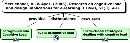 MainMerrinboyer_Ayers_2005_CogLoad, Merrienboer, V., & Ayes. (2005). Research on cognitive load and design implications for e-learning. ETR&D, 53(3), 4-8. distinquishes types ofcognitive load, Merrienboer, V., & Ayes. (2005). Research on cognitive load and design implications for e-learning. ETR&D, 53(3), 4-8. discusses Instructional Strategies dealilng with cognitve load, Merrienboer, V., & Ayes. (2005). Research on cognitive load and design implications for e-learning. ETR&D, 53(3), 4-8. provides background info Cognitive Load