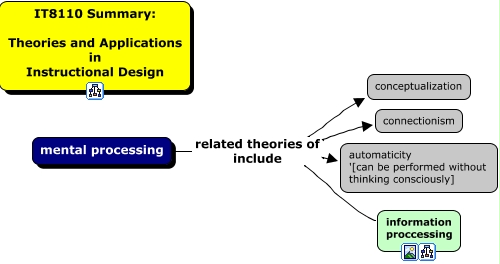mental_processing_CLT_IT8110_Summary, mental processing related theories of include connectionism, mental processing related theories of include automaticity '[can be performed without thinking consciously], mental processing related theories of include information proccessing, mental processing related theories of include conceptualization