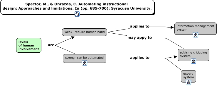levels_human_involvement_Spector_ohrazda_automating_ID, levels of human involvement are weak- require human hand, weak- require human hand may appy to advising critiquing system, weak- require human hand applies to information management system, strong- can be automated applies to advising critiquing system, strong- can be automated applies to expert system, levels of human involvement are strong- can be automated