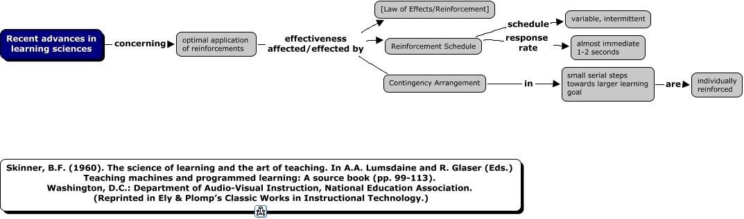 NewAdvancesUseofReinforcement_Skinner_scienceLearningArtTeaching_1960, optimal application of reinforcements effectiveness affected/effected by Contingency Arrangement, Reinforcement Schedule schedule variable, intermittent, small serial steps towards larger learning goal are individually reinforced, optimal application of reinforcements effectiveness affected/effected by Reinforcement Schedule, Recent advances in learning sciences concerning optimal application of reinforcements, Contingency Arrangement in small serial steps towards larger learning goal, optimal application of reinforcements effectiveness affected/effected by [Law of Effects/Reinforcement], Reinforcement Schedule response rate almost immediate 1-2 seconds