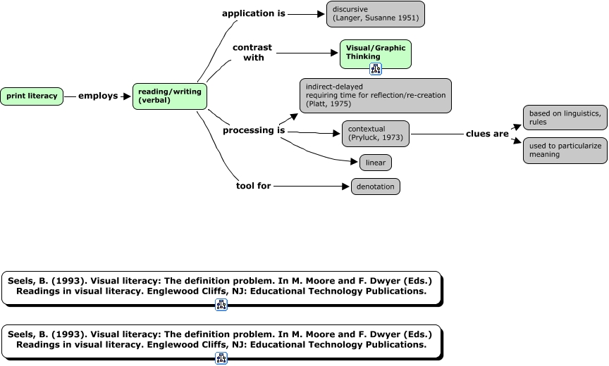 PrintLiteracy_seels_visualLiteracy_1993, reading/writing (verbal) processing is linear, reading/writing (verbal) tool for denotation, reading/writing (verbal) contrast with Visual/Graphic Thinking, reading/writing (verbal) processing is indirect-delayed requiring time for reflection/re-creation (Platt, 1975), contextual (Pryluck, 1973) clues are used to particularize meaning, reading/writing (verbal) processing is contextual (Pryluck, 1973), reading/writing (verbal) application is discursive (Langer, Susanne 1951), print literacy employs reading/writing (verbal), contextual (Pryluck, 1973) clues are based on linguistics, rules