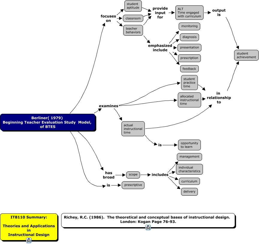 Berliner_1979_Richey_1986_instruc_models, Berliner( 1979) Beginning Teacher Evaluation Study Model, of BTES examines student practice time, teacher behaviors emphasized include presentation, allocated instructional time in relationship to student achievement, student practice time in relationship to student achievement, scope includes curriculum, classroom provide input for ALT Time engaged with curriculum, teacher behaviors emphasized include diagnosis, teacher behaviors emphasized include monitoring, Berliner( 1979) Beginning Teacher Evaluation Study Model, of BTES focuses on teacher behaviors, scope includes management