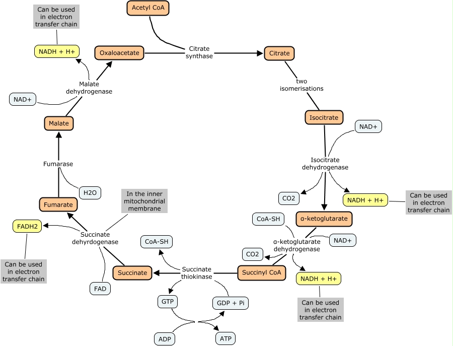 Citric acid cycle, Succinyl CoA Succinate thiokinase GTP, Acetyl CoA Citrate synthase Citrate, NAD+ Isocitrate dehydrogenase CO2, Isocitrate Isocitrate dehydrogenase CO2, NADH + H+ Can be used in electron transfer chain, H2O Fumarase Malate, FAD Succinate dehyrdogenase FADH2, NAD+ α-ketoglutarate dehydrogenase Succinyl CoA, Succinate Succinate dehyrdogenase In the inner mitochondrial membrane, NADH + H+ Can be used in electron transfer chain