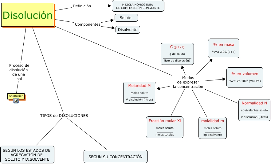 Disoluciones, Disolución Modos de expresar la concentración C (g s / l) g de soluto ________________ litro de disolución), Disolución Modos de expresar la concentración Molaridad M moles soluto __________ V disolución (litros), Disolución Componentes Soluto, Disolución Modos de expresar la concentración Fracción molar Xi moles soluto _________ moles totales, Disolución Modos de expresar la concentración Normalidad N equivalentes soluto ____________ V disolución (litros), Disolución TIPOS de DISOLUCIONES SEGÚN LOS ESTADOS DE AGREGACIÓN DE SOLUTO Y DISOLVENTE, Disolución Proceso de disolución de una sal Animación, Disolución Modos de expresar la concentración % en volumen %v= Va.100/ (Va+Vb), Disolución Modos de expresar la concentración molalidad m moles soluto _________ kg disolvente, Disolución Modos de expresar la concentración % en masa %=a .100/(a+b)