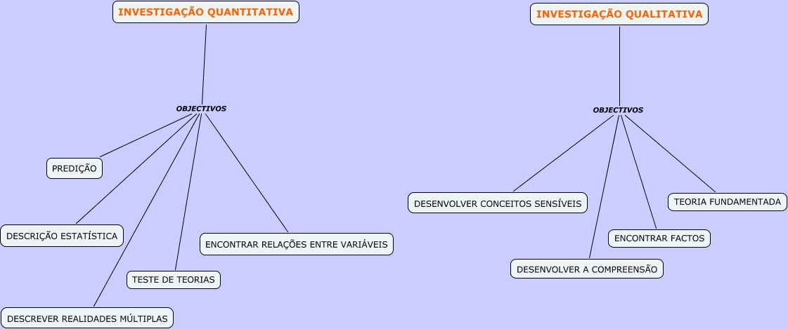 OBJECTIVOS, INVESTIGAÇÃO QUALITATIVA OBJECTIVOS ENCONTRAR FACTOS, INVESTIGAÇÃO QUANTITATIVA OBJECTIVOS DESCRIÇÃO ESTATÍSTICA, INVESTIGAÇÃO QUANTITATIVA OBJECTIVOS PREDIÇÃO, INVESTIGAÇÃO QUANTITATIVA OBJECTIVOS ENCONTRAR RELAÇÕES ENTRE VARIÁVEIS, INVESTIGAÇÃO QUALITATIVA OBJECTIVOS TEORIA FUNDAMENTADA, INVESTIGAÇÃO QUANTITATIVA OBJECTIVOS DESCREVER REALIDADES MÚLTIPLAS, INVESTIGAÇÃO QUALITATIVA OBJECTIVOS DESENVOLVER CONCEITOS SENSÍVEIS, INVESTIGAÇÃO QUALITATIVA OBJECTIVOS DESENVOLVER A COMPREENSÃO, INVESTIGAÇÃO QUANTITATIVA OBJECTIVOS TESTE DE TEORIAS