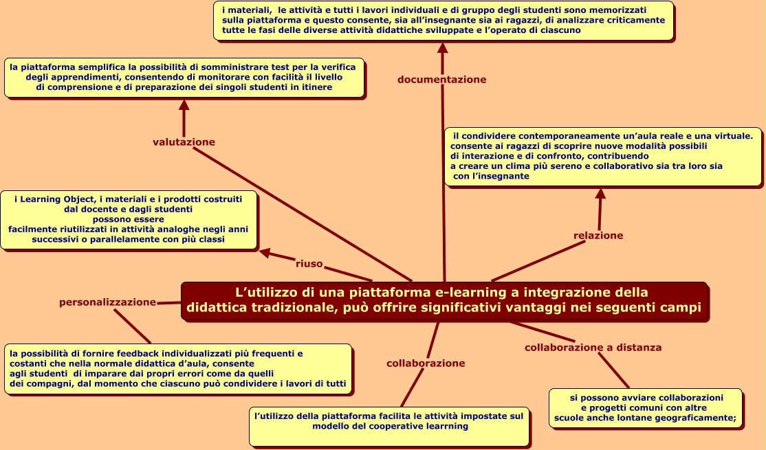 vantaggi, L’utilizzo di una piattaforma e-learning a integrazione della didattica tradizionale, può offrire significativi vantaggi nei seguenti campi collaborazione a distanza si possono avviare collaborazioni e progetti comuni con altre scuole anche lontane geograficamente;, L’utilizzo di una piattaforma e-learning a integrazione della didattica tradizionale, può offrire significativi vantaggi nei seguenti campi valutazione la piattaforma semplifica la possibilità di somministrare test per la verifica degli apprendimenti, consentendo di monitorare con facilità il livello di comprensione e di preparazione dei singoli studenti in itinere, L’utilizzo di una piattaforma e-learning a integrazione della didattica tradizionale, può offrire significativi vantaggi nei seguenti campi riuso i Learning Object, i materiali e i prodotti costruiti dal docente e dagli studenti possono essere facilmente riutilizzati in attività analoghe negli anni successivi o parallelamente con più classi, L’utilizzo di una piattaforma e-learning a integrazione della didattica tradizionale, può offrire significativi vantaggi nei seguenti campi relazione il condividere contemporaneamente un’aula reale e una virtuale. consente ai ragazzi di scoprire nuove modalità possibili di interazione e di confronto, contribuendo a creare un clima più sereno e collaborativo sia tra loro sia con l’insegnante, L’utilizzo di una piattaforma e-learning a integrazione della didattica tradizionale, può offrire significativi vantaggi nei seguenti campi collaborazione l’utilizzo della piattaforma facilita le attività impostate sul modello del cooperative learrning, L’utilizzo di una piattaforma e-learning a integrazione della didattica tradizionale, può offrire significativi vantaggi nei seguenti campi personalizzazione la possibilità di fornire feedback individualizzati più frequenti e costanti che nella normale didattica d’aula, consente agli studenti di imparare dai propri errori come da quelli dei compagni, dal momento che ciascuno può condividere i lavori di tutti, L’utilizzo di una piattaforma e-learning a integrazione della didattica tradizionale, può offrire significativi vantaggi nei seguenti campi documentazione i materiali, le attività e tutti i lavori individuali e di gruppo degli studenti sono memorizzati sulla piattaforma e questo consente, sia all’insegnante sia ai ragazzi, di analizzare criticamente tutte le fasi delle diverse attività didattiche sviluppate e l’operato di ciascuno