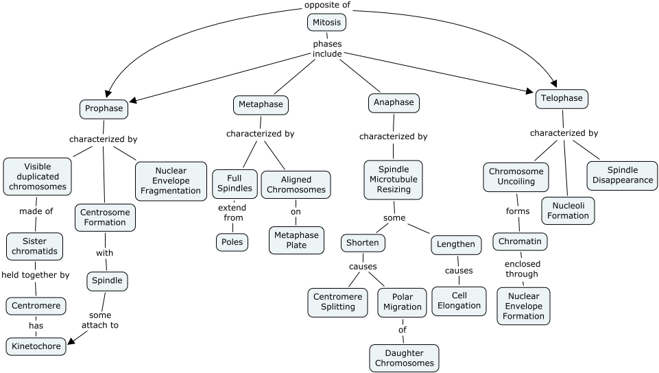 Mitosis, Shorten causes Polar Migration, Metaphase characterized by Full Spindles, Metaphase characterized by Aligned Chromosomes, Mitosis phases include Metaphase, Spindle some attach to Kinetochore, Mitosis phases include Telophase, Visible duplicated chromosomes made of Sister chromatids, Lengthen causes Cell Elongation, Centrosome Formation with Spindle, Aligned Chromosomes on Metaphase Plate