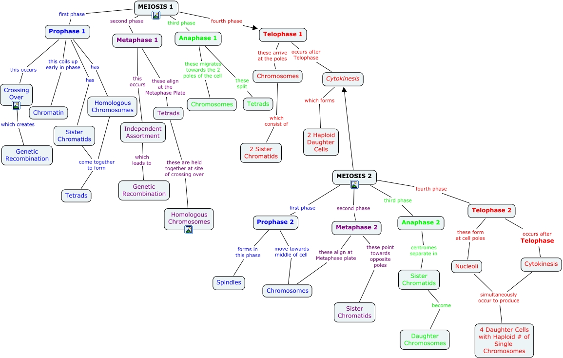cell repro meiosis AS SJ, Cytokinesis simultaneously occur to produce 4 Daughter Cells with Haploid # of Single Chromosomes, Anaphase 2 centromes separate in Sister Chromatids, MEIOSIS 1 fourth phase Telophase 1, Prophase 1 has Sister Chromatids, Metaphase 1 this occurs Independent Assortment, Independent Assortment which leads to Genetic Recombination, MEIOSIS 2 third phase Anaphase 2, Cytokinesis which forms 2 Haploid Daughter Cells, MEIOSIS 2 fourth phase Telophase 2, Metaphase 2 these align at Metaphase plate Chromosomes