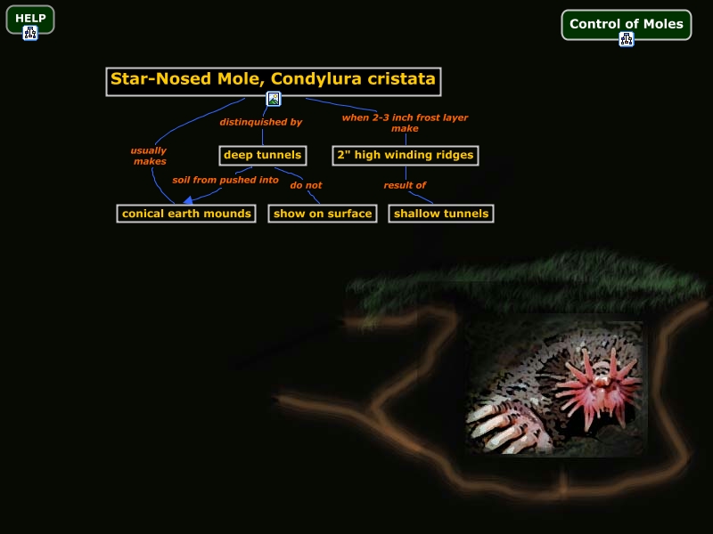 mole_ID_of_star-nosed mole_Condylura cristata, deep tunnels soil from pushed into conical earth mounds, Star-Nosed Mole, Condylura cristata when 2-3 inch frost layer make 2" high winding ridges, Star-Nosed Mole, Condylura cristata distinquished by deep tunnels, deep tunnels do not show on surface, 2" high winding ridges result of shallow tunnels, Star-Nosed Mole, Condylura cristata usually makes conical earth mounds