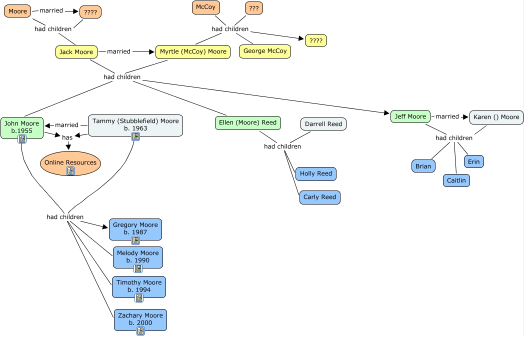 This Concept Map has information related to: Moore family Tree, ??? had children Myrtle (McCoy) Moore, Darrell Reed had children Carly Reed, Moore married ????, Ellen (Moore) Reed had children Holly Reed, Moore had children Jack Moore, Karen () Moore had children Caitlin, Tammy (Stubblefield) Moore b. 1963 had children Gregory Moore b. 1987, ??? had children George McCoy, Karen () Moore had children Brian, Jeff Moore married Karen () Moore