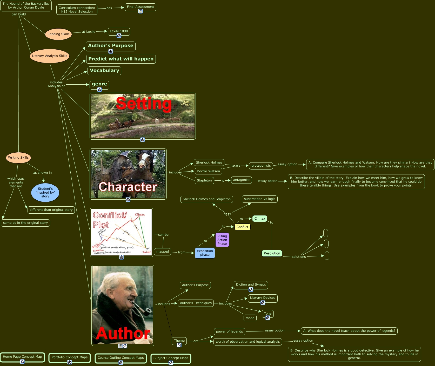 This Concept Map, created with IHMC CmapTools, has information related to: The Hound of the Baskervilles, Resolution solutions, includes Author's Purpose, worth of observation and logical analysis essay option B. Describe why Sherlock Holmes is a good detective. Give an example of how he works and how his method is important both to solving the mystery and to life in general., Literary Analysis Skills includes Analysis of Vocabulary, can be mapped, Resolution solutions, Author's Techniques includes Literary Devices, Author's Techniques includes Tone, antagonist essay option B. Describe the villain of the story. Explain how we meet him, how we grow to know him better, and how we learn enough finally to become convinced that he could do these terrible things. Use examples from the book to prove your points., The Hound of the Baskervilles by Arthur Conan Doyle can build Writing Skills, power of legends essay option A. What does the novel teach about the power of legends?, Sherlock Holmes are protagonists, Doctor Watson are protagonists, includes Theme, includes Stapleton, includes Doctor Watson, Theme are power of legends, Writing Skills which uses elements that are different than original story, protagonists essay option A. Compare Sherlock Holmes and Watson. How are they similar? How are they different? Give examples of how their characters help shape the novel., mapped from Exposition phase