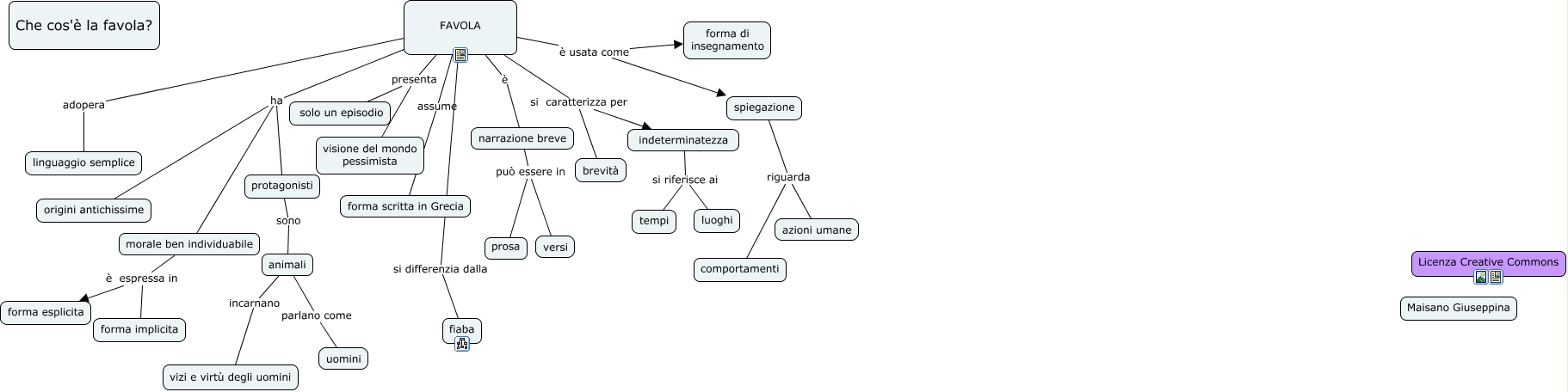 Questa Cmap, creata con IHMC CmapTools, contiene informazioni relative a: la favola, spiegazione riguarda comportamenti, animali parlano come uomini, FAVOLA ha origini antichissime, FAVOLA si differenzia dalla fiaba, indeterminatezza si riferisce ai luoghi, FAVOLA si caratterizza per indeterminatezza, FAVOLA è usata come forma di insegnamento, FAVOLA è narrazione breve, FAVOLA adopera linguaggio semplice, FAVOLA si caratterizza per brevità, morale ben individuabile è espressa in forma esplicita, FAVOLA ha protagonisti, spiegazione riguarda azioni umane, morale ben individuabile è espressa in forma implicita, FAVOLA ha morale ben individuabile, FAVOLA è usata come spiegazione, animali incarnano vizi e virtù degli uomini, FAVOLA presenta solo un episodio, protagonisti sono animali, FAVOLA presenta visione del mondo pessimista