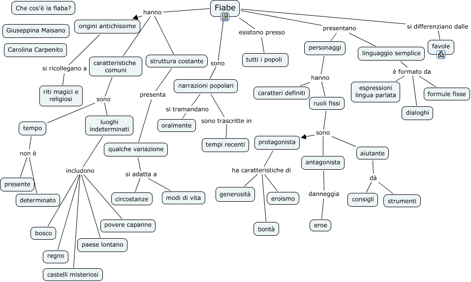 Questa Mappa Concettuale ha informazioni correlate a: Fiabe, personaggi hanno caratteri definiti, linguaggio semplice è formato da dialoghi, luoghi indeterminati includono paese lontano, Fiabe hanno origini antichissime, ruoli fissi sono antagonista, luoghi indeterminati includono bosco, tempo non è presente, luoghi indeterminati includono povere capanne, antagonista danneggia eroe, Fiabe presentano personaggi