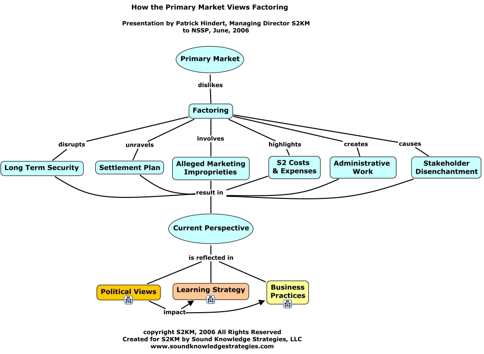 How the Primary Market Views Factoring, Political Views impact Learning Strategy, Primary Market dislikes Factoring, Stakeholder Disenchantment result in Current Perspective, Long Term Security result in Current Perspective, Factoring involves Alleged Marketing Improprieties, Alleged Marketing Improprieties result in Current Perspective, Current Perspective is reflected in Business Practices, Factoring unravels Settlement Plan, Factoring creates Administrative Work, Factoring causes Stakeholder Disenchantment