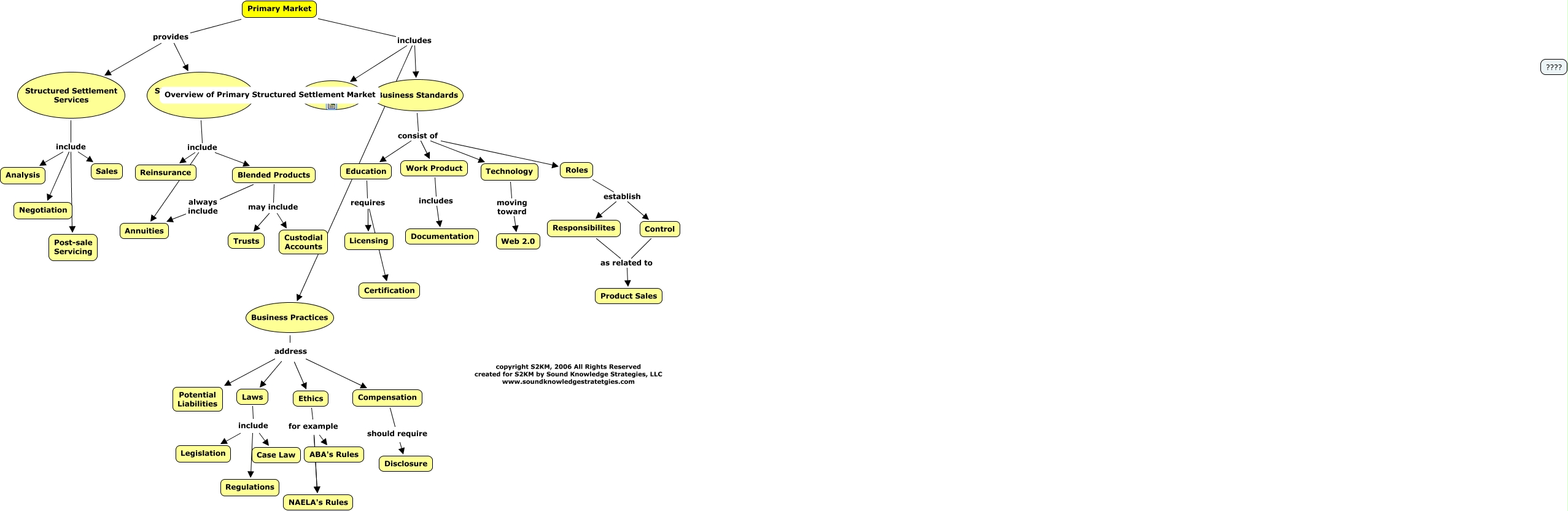 This Concept Map, created with IHMC CmapTools, has information related to: Primary Market2, Blended Products may include Custodial Accounts, Laws include Regulations, Work Product includes Documentation, Business Practices address Ethics, Structured Settlement Services include Negotiation, Ethics for example NAELA's Rules, Technology moving toward Web 2.0, Roles establish Responsibilites, Business Practices address Laws, Structured Settlement Services include Post-sale Servicing, Business Standards consist of Work Product, Control as related to Product Sales, Structured Settlement Services include Analysis, Structured Settlement Services include Sales, Business Practices address Potential Liabilities, Business Standards consist of Roles, Laws include Legislation, Responsibilites as related to Product Sales, Laws include Case Law, Structured Settlement Products include Reinsurance