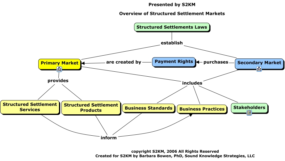 Overview of Structured Settlement Market, Payment Rights are created by Primary Market, Structured Settlements Laws establish Primary Market, Secondary Market includes Business Practices, Structured Settlement Products inform Business Practices, Structured Settlement Services inform Business Practices, Secondary Market includes Business Standards, Business Standards inform Business Practices, Primary Market provides Structured Settlement Products, Structured Settlements Laws establish Secondary Market, Primary Market includes Stakeholders
