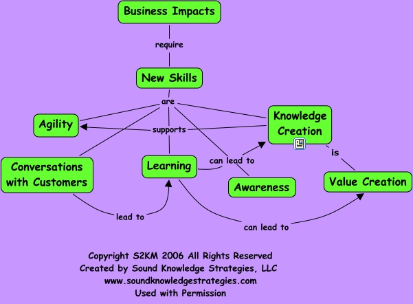 Business Impacts, New Skills are Agility, New Skills are Awareness, Learning can lead to Value Creation, Conversations with Customers lead to Learning, Knowledge Creation is Value Creation, New Skills are Conversations with Customers, Knowledge Creation supports Agility, Learning can lead to Knowledge Creation, New Skills are Knowledge Creation, New Skills are Learning