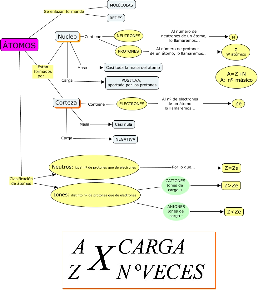 Estructura atómica, Iones: distinto nº de protones que de electrones CATIONES Iones de carga + Z>Ze, PROTONES Contiene NEUTRONES, ÁTOMOS Se enlazan formando REDES, ÁTOMOS Están formados por... Núcleo, NEUTRONES Al número de neutrones de un átomo, lo llamaremos... N, PROTONES Al número de protones de un átomo, lo llamaremos.. Z nº atómico, Corteza Contiene ELECTRONES, ÁTOMOS Se enlazan formando MOLÉCULAS, Iones: distinto nº de protones que de electrones ANIONES Iones de carga - Z<Ze, Núcleo Contiene NEUTRONES