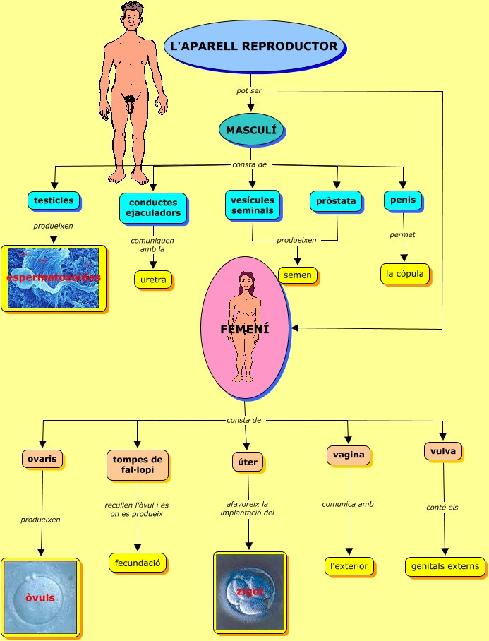 Este mapa conceptual tiene información relacionada a: organs reproductors, MASCULÍ consta de pròstata, úter afavoreix la implantació del zigot, FEMENÍ consta de ovaris, MASCULÍ consta de vesícules seminals, tompes de fal·lopi recullen l'òvul i és on es produeix fecundació, MASCULÍ consta de testicles, ovaris produeixen òvuls, pròstata produeixen semen, vagina comunica amb l'exterior, L'APARELL REPRODUCTOR pot ser MASCULÍ, FEMENÍ consta de vagina, MASCULÍ consta de conductes ejaculadors, vesícules seminals produeixen semen, L'APARELL REPRODUCTOR pot ser FEMENÍ, conductes ejaculadors comuniquen amb la uretra, penis permet la còpula, MASCULÍ consta de penis, FEMENÍ consta de vulva, vulva conté els genitals externs, FEMENÍ consta de tompes de fal·lopi