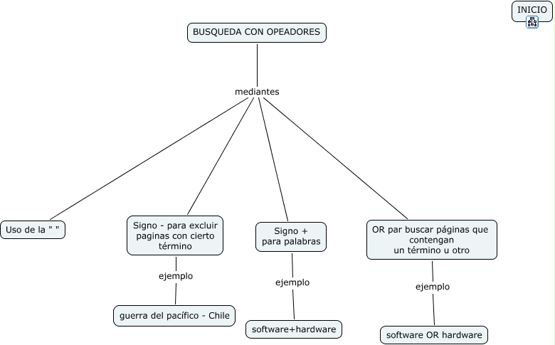 Este mapa conceptual tiene información relacionada a: Operadores, BUSQUEDA CON OPEADORES mediantes Signo + para palabras, BUSQUEDA CON OPEADORES mediantes Signo - para excluir paginas con cierto término, BUSQUEDA CON OPEADORES mediantes Uso de la " ", OR par buscar páginas que contengan un término u otro ejemplo software OR hardware, Signo + para palabras ejemplo software+hardware, BUSQUEDA CON OPEADORES mediantes OR par buscar páginas que contengan un término u otro, Signo - para excluir paginas con cierto término ejemplo guerra del pacífico - Chile