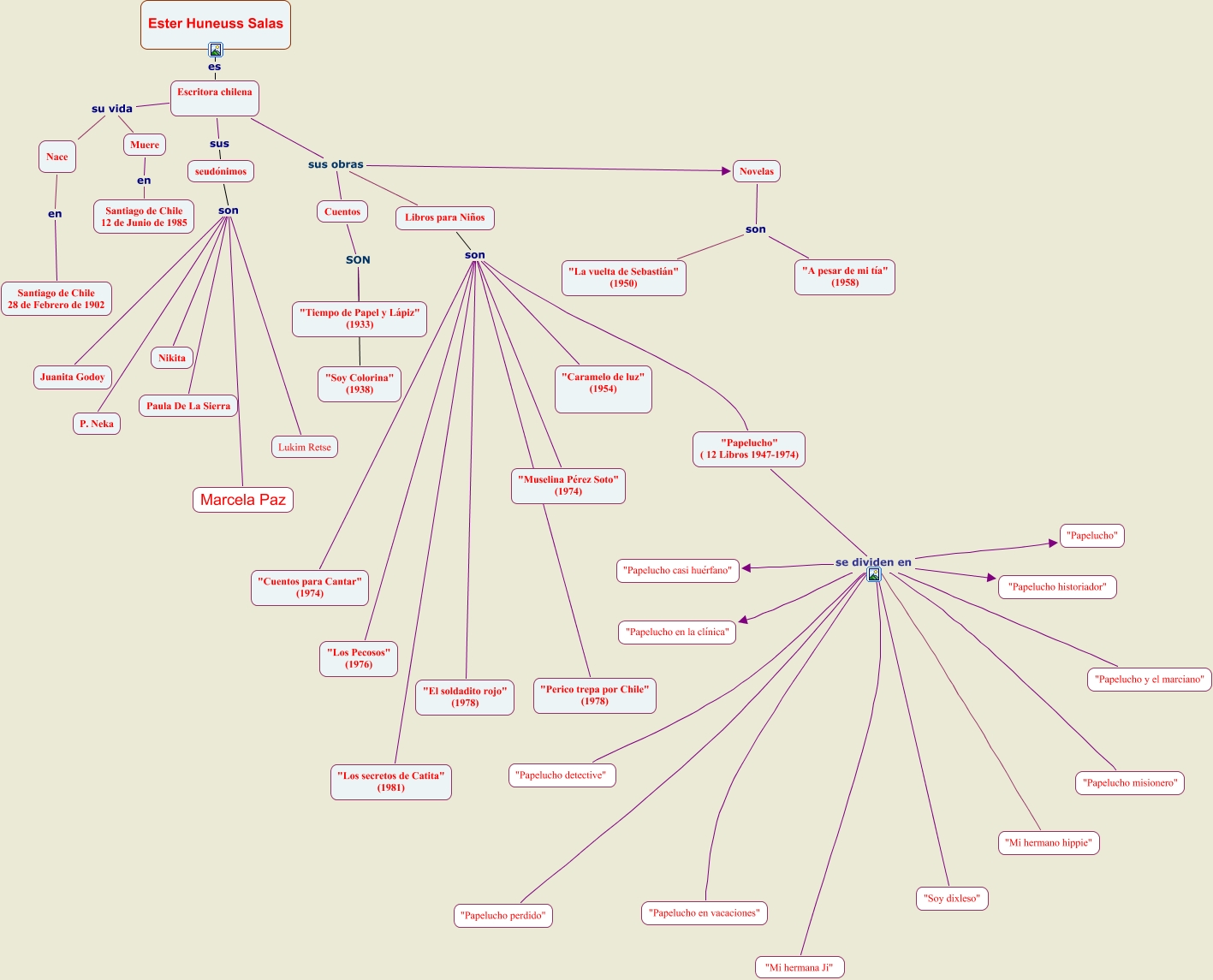Este mapa conceptual tiene información relacionada a: Marcela Paz, Novelas son "A pesar de mi tía" (1958), seudónimos son P. Neka, "Papelucho" ( 12 Libros 1947-1974) se dividen en "Papelucho detective", "Papelucho" ( 12 Libros 1947-1974) se dividen en "Papelucho historiador", Escritora chilena sus obras Cuentos, Escritora chilena sus obras Novelas, "Papelucho" ( 12 Libros 1947-1974) se dividen en "Papelucho perdido", "Papelucho" ( 12 Libros 1947-1974) se dividen en "Papelucho casi huérfano", Cuentos SON "Tiempo de Papel y Lápiz" (1933), Libros para Niños son "Muselina Pérez Soto" (1974)
