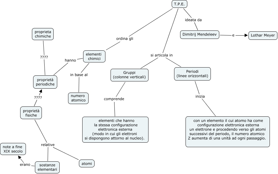Questa Mappa Concettuale ha informazioni correlate a: TPE v t e ska, proprietà fisiche relative sostanze elementari, proprietà fisiche relative atomi, elementi chimici hanno proprietà periodiche, proprietà fisiche ???? proprietà periodiche, proprieta chimiche ???? proprietà periodiche, T.P.E. si articola in Periodi (linee orizzontali), T.P.E. ordina gli elementi chimici, T.P.E. si articola in Gruppi (colonne verticali), Gruppi (colonne verticali) comprende elementi che hanno la stessa configurazione elettronica esterna (modo in cui gli elettroni si dispongono attorno al nucleo)., Periodi (linee orizzontali) inizia con un elemento il cui atomo ha come configurazione elettronica esterna un elettrone e procedendo verso gli atomi successivi del periodo, il numero atomico Z aumenta di una unità ad ogni passaggio., Dimitrij Mendeleev e Lothar Meyer, sostanze elementari erano note a fine XIX secolo, elementi chimici in base al numero atomico, T.P.E. ideata da Dimitrij Mendeleev