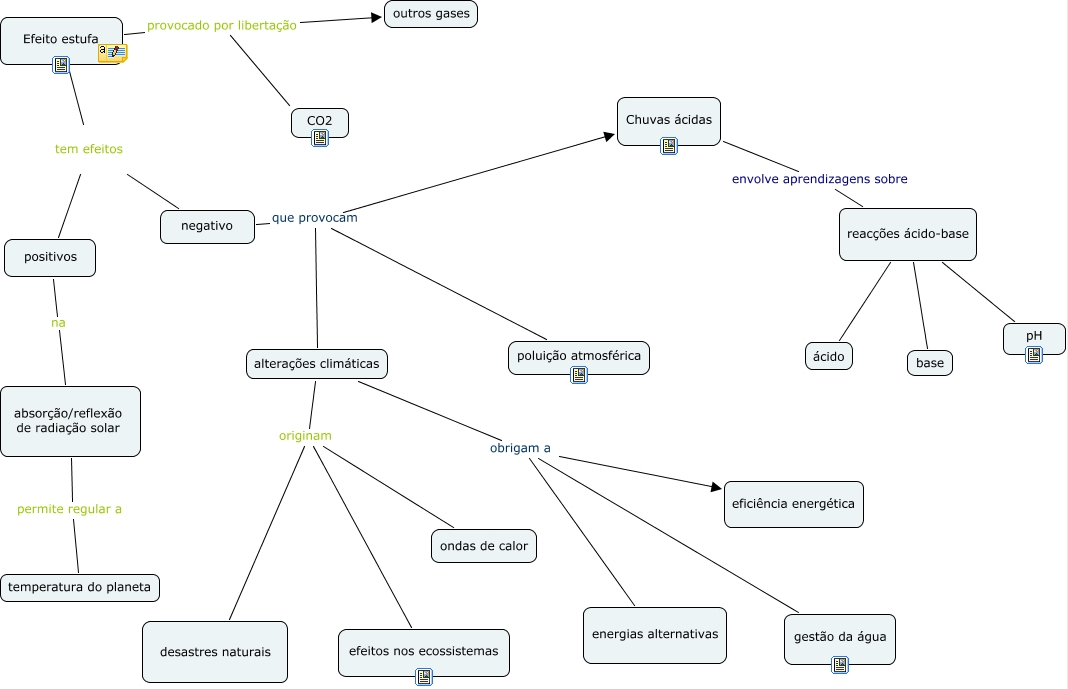 Este Mapa Conceitual tem informações relacionadas a: Conceitos_mudanca_global, positivos na absorção/reflexão de radiação solar, alterações climáticas obrigam a gestão da água, absorção/reflexão de radiação solar permite regular a temperatura do planeta, Efeito estufa provocado por libertação CO2, Efeito estufa tem efeitos negativo, negativo que provocam Chuvas ácidas, Chuvas ácidas envolve aprendizagens sobre reacções ácido-base, negativo que provocam alterações climáticas, reacções ácido-base pH, alterações climáticas obrigam a eficiência energética, alterações climáticas originam ondas de calor, alterações climáticas obrigam a energias alternativas, Efeito estufa provocado por libertação outros gases, alterações climáticas originam efeitos nos ecossistemas, reacções ácido-base base, reacções ácido-base ácido, alterações climáticas originam desastres naturais, negativo que provocam poluição atmosférica, Efeito estufa tem efeitos positivos