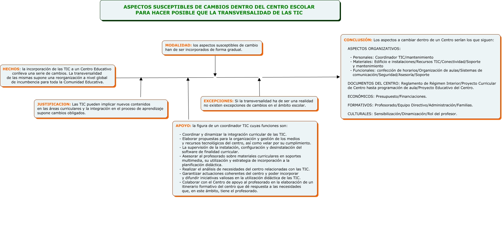 Este Cmap, tiene información relacionada con: Hilo Tansversalidad_TELLO VALENZUELA_DAVID, HECHOS: la incorporación de las TIC a un Centro Educativo conlleva una serie de cambios. La transversalidad de las mismas supone una reorganización a nivel global de incumbencia para toda la Comunidad Educativa. CONCLUSIÓN: Los aspectos a cambiar dentro de un Centro serían los que siguen: ASPECTOS ORGANIZATIVOS: - Personales: Coordinador TIC/mantenimiento - Materiales: Edificio e instalaciones/Recursos TIC/Conectividad/Soporte y mantenimiento - Funcionales: confección de horarios/Organización de aulas/Sistemas de comunicación/Seguridad/Asesoría/Soporte DOCUMENTOS DEL CENTRO: Reglamento de Régimen Interior/Proyecto Curricular de Centro hasta programación de aula/Proyecto Educativo del Centro. ECONÓMICOS: Presupuesto/Financiaciones. FORMATIVOS: Profesorado/Equipo Directivo/Administración/Familias. CULTURALES: Sensibilización/Dinamización/Rol del profesor., JUSTIFICACION: Las TIC pueden implicar nuevos contenidos en las áreas curriculares y la integración en el proceso de aprendizaje supone cambios obligados. ????, EXCEPCIONES: Si la transversalidad ha de ser una realidad no existen excepciones de cambios en el ámbito escolar. ????, MODALIDAD: los aspectos susceptibles de cambio han de ser incorporados de forma gradual. ????, APOYO: la figura de un coordinador TIC cuyas funciones son: - Coordinar y dinamizar la integración curricular de las TIC. - Elaborar propuestas para la organización y gestión de los medios y recursos tecnológicos del centro, así como velar por su cumplimiento. - La supervisión de la instalación, configuración y desinstalación del software de finalidad curricular. - Asesorar al profesorado sobre materiales curriculares en soportes multimedia, su utilización y estrategia de incorporación a la planificación didáctica. - Realizar el análisis de necesidades del centro relacionadas con las TIC. - Garantizar actuaciones coherentes del centro y poder incorporar y difundir iniciativas valiosas en la utilización didáctica de las TIC. - Colaborar con el Centro de apoyo al profesorado en la elaboración de un itinerario formativo del centro que dé respuesta a las necesidades que, en este ámbito, tiene el profesorado. ????
