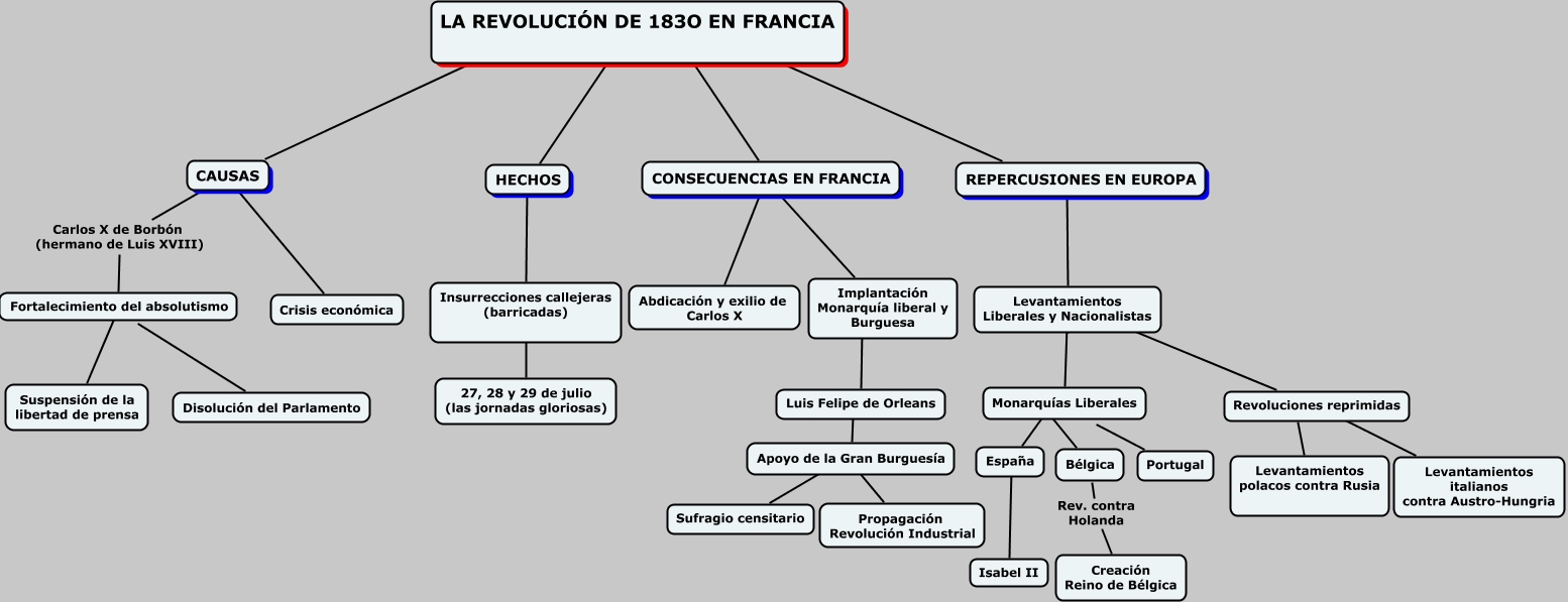 Este Cmap, tiene información relacionada con: Revolución 1830, España ???? Isabel II, CONSECUENCIAS EN FRANCIA ???? Abdicación y exilio de Carlos X, CAUSAS Carlos X de Borbón (hermano de Luis XVIII) Fortalecimiento del absolutismo, Luis Felipe de Orleans ???? Apoyo de la Gran Burguesía, Apoyo de la Gran Burguesía ???? Sufragio censitario, CAUSAS ???? Crisis económica, Fortalecimiento del absolutismo ???? Disolución del Parlamento, Monarquías Liberales ???? Portugal, Revoluciones reprimidas ???? Levantamientos polacos contra Rusia, REPERCUSIONES EN EUROPA ???? Levantamientos Liberales y Nacionalistas, Bélgica Rev. contra Holanda Creación Reino de Bélgica, LA REVOLUCIÓN DE 183O EN FRANCIA ???? REPERCUSIONES EN EUROPA, HECHOS ???? Insurrecciones callejeras (barricadas), LA REVOLUCIÓN DE 183O EN FRANCIA ???? HECHOS, CONSECUENCIAS EN FRANCIA ???? Implantación Monarquía liberal y Burguesa, Levantamientos Liberales y Nacionalistas ???? Revoluciones reprimidas, Apoyo de la Gran Burguesía ???? Propagación Revolución Industrial, Fortalecimiento del absolutismo ???? Suspensión de la libertad de prensa, Revoluciones reprimidas ???? Levantamientos italianos contra Austro-Hungria, Implantación Monarquía liberal y Burguesa ???? Luis Felipe de Orleans