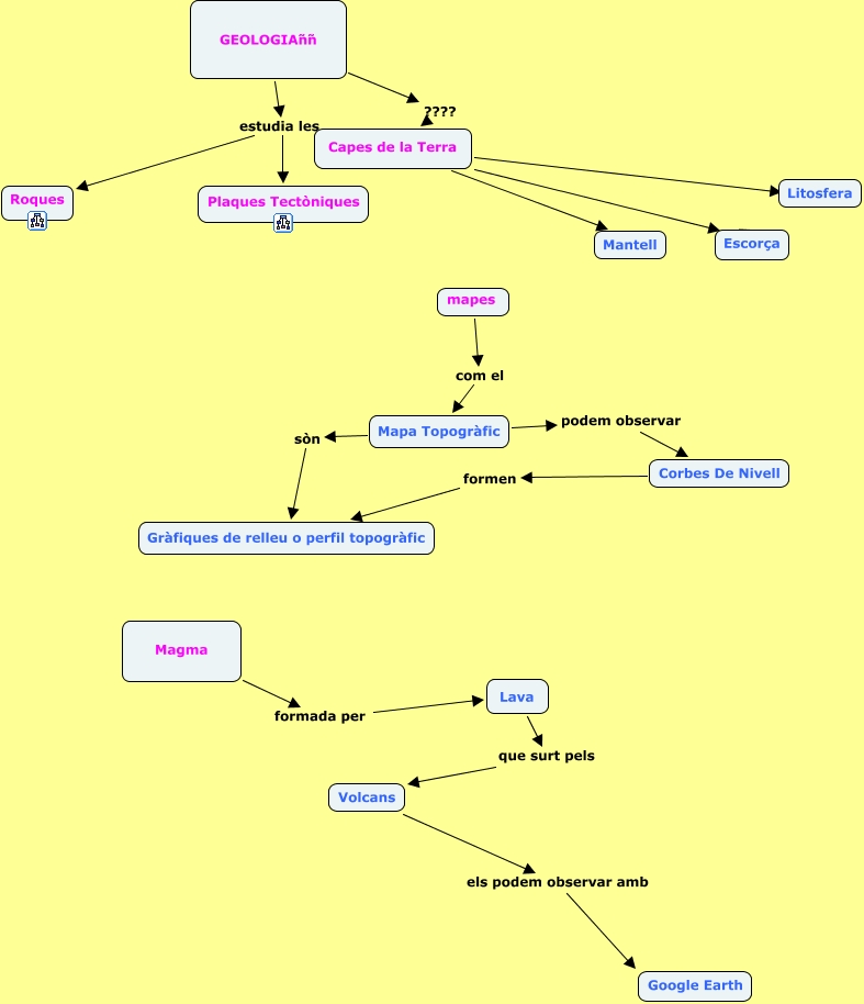 Este mapa conceptual tiene información relacionada a: geologia, Corbes De Nivell formen Gràfiques de relleu o perfil topogràfic, GEOLOGIAññ estudia les Roques, Mapa Topogràfic sòn Gràfiques de relleu o perfil topogràfic, Capes de la Terra ???? Escorça, Capes de la Terra ???? Mantell, Magma formada per Lava, mapes com el Mapa Topogràfic, Capes de la Terra ???? Litosfera, Volcans els podem observar amb Google Earth, Mapa Topogràfic podem observar Corbes De Nivell, GEOLOGIAññ ???? Capes de la Terra, GEOLOGIAññ estudia les Plaques Tectòniques, Lava que surt pels Volcans