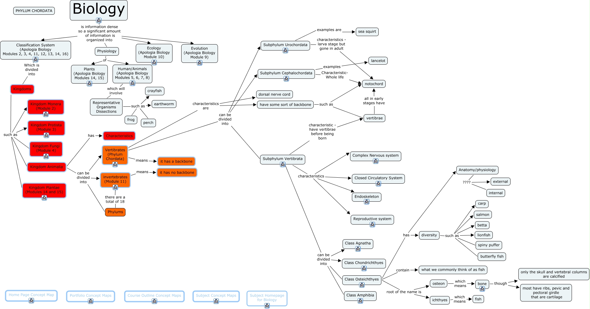 This Concept Map, created with IHMC CmapTools, has information related to: Class Osteichthes, Vertibrates (Phylum Chordata) can be divided into Subphylum Urochordata, Kingdoms such as Kingdom Fungi (Module 4), Subphylum Urochordata characteristics - larva stage but gone in adult notochord, Kingdom Animalia can be divided into Vertibrates (Phylum Chordata), Subphylum Vertibrata can be divided into Class Agnatha, Kingdom Animalia can be divided into invertebrates (Module 11), Classification System (Apologia Biology Modules 2, 3, 4, 11, 12, 13, 14, 16) Which is divided into Kingdoms, bone though most have ribs, pevic and pectoral girdle that are cartilage, Representative Organisms Dissections such as perch, Subphylum Vertibrata characteristics Closed Circulatory System, have some sort of backbone such as notochord, Subphylum Vertibrata characteristic - have vertibrae before being born vertibrae, Kingdoms such as Kingdom Protista (Module 3), Vertibrates (Phylum Chordata) can be divided into Subphylum Cephalochordata, Representative Organisms Dissections such as earthworm, Subphylum Vertibrata can be divided into Class Chondrichthyes, Biology is information dense so a significant amount of information is organized into Evolution (Apologia Biology Module 9), invertebrates (Module 11) there are a total of 18 Phylums, Class Osteichthyes root of the name is ichthyes, have some sort of backbone such as vertibrae