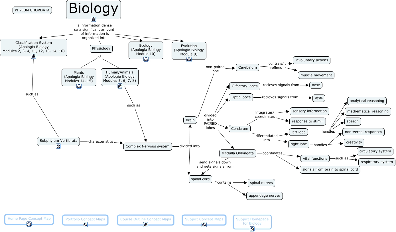 This Concept Map, created with IHMC CmapTools, has information related to: Nervous System, spinal cord contains spinal nerves, Human/Animals (Apologia Biology Modules 5, 6, 7, 8) such as Complex Nervous system, Cerebrum diferentiated into left lobe, spinal cord contains appendage nerves, brain divided into PAIRED lobes Cerebrum, Cerebelum contrals/ refines muscle movement, Complex Nervous system divided into brain, Medulla Oblongata coordinates vital functions, Physiology of Plants (Apologia Biology Modules 14, 15), brain divided into PAIRED lobes Medulla Oblongata, Biology is information dense so a significant amount of information is organized into Evolution (Apologia Biology Module 9), Optic lobes recieves signals from eyes, brain non-paired lobe Cerebelum, Cerebrum integrates/ coordinates sensory information, Complex Nervous system divided into spinal cord, Biology is information dense so a significant amount of information is organized into Classification System (Apologia Biology Modules 2, 3, 4, 11, 12, 13, 14, 16), Subphylum Vertibrata characteristics Complex Nervous system, Medulla Oblongata send signals down and gets signals from spinal cord, right lobe handles creativity, Cerebelum contrals/ refines involuntary actions
