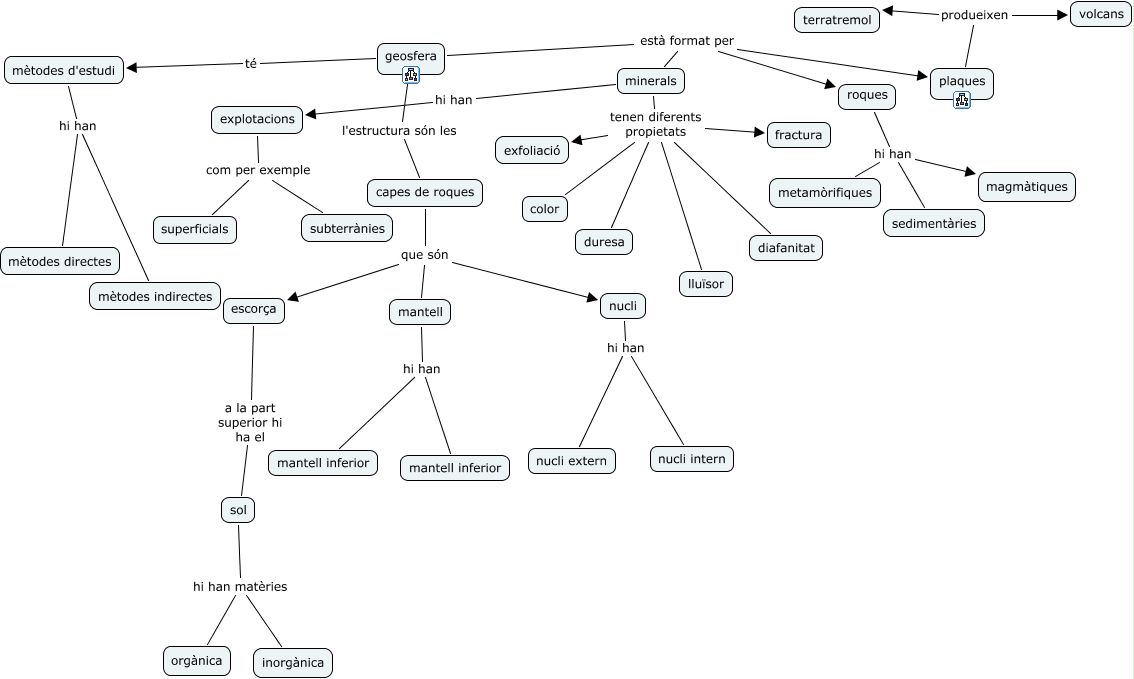 Este Cmap, tiene información relacionada con: geosfera, explotacions com per exemple subterrànies, mantell hi han mantell inferior, roques hi han metamòrifiques, geosfera està format per minerals, mètodes d'estudi hi han mètodes directes, capes de roques que són nucli, sol hi han matèries inorgànica, minerals tenen diferents propietats exfoliació, capes de roques que són escorça, nucli hi han nucli intern, explotacions com per exemple superficials, geosfera està format per roques, mètodes d'estudi hi han mètodes indirectes, nucli hi han nucli extern, capes de roques que són mantell, escorça a la part superior hi ha el sol, minerals tenen diferents propietats duresa, sol hi han matèries orgànica, geosfera l'estructura són les capes de roques, minerals tenen diferents propietats diafanitat