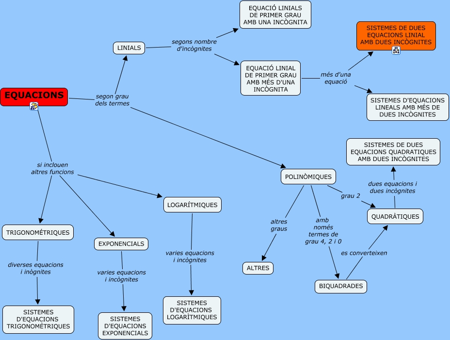 Este Cmap, tiene información relacionada con: EQUACIONS, EQUACIÓ LINIAL DE PRIMER GRAU AMB MÉS D'UNA INCÒGNITA més d'una equació SISTEMES D'EQUACIONS LINEALS AMB MÉS DE DUES INCÒGNITES, EQUACIONS si inclouen altres funcions EXPONENCIALS, TRIGONOMÉTRIQUES diverses equacions i inògnites SISTEMES D'EQUACIONS TRIGONOMÈTRIQUES, EQUACIÓ LINIAL DE PRIMER GRAU AMB MÉS D'UNA INCÒGNITA més d'una equació SISTEMES DE DUES EQUACIONS LINIAL AMB DUES INCÒGNITES, LINIALS segons nombre d'incògnites EQUACIÓ LINIALS DE PRIMER GRAU AMB UNA INCÒGNITA, POLINÒMIQUES amb només termes de grau 4, 2 i 0 BIQUADRADES, QUADRÀTIQUES dues equacions i dues incògnites SISTEMES DE DUES EQUACIONS QUADRATIQUES AMB DUES INCÒGNITES, EQUACIONS segon grau dels termes LINIALS, LINIALS segons nombre d'incògnites EQUACIÓ LINIAL DE PRIMER GRAU AMB MÉS D'UNA INCÒGNITA, LOGARÍTMIQUES varies equacions i incògnites SISTEMES D'EQUACIONS LOGARÌTMIQUES, EQUACIONS si inclouen altres funcions TRIGONOMÉTRIQUES, EQUACIONS segon grau dels termes POLINÒMIQUES, POLINÒMIQUES altres graus ALTRES, EQUACIONS si inclouen altres funcions LOGARÍTMIQUES, POLINÒMIQUES grau 2 QUADRÀTIQUES, BIQUADRADES es converteixen QUADRÀTIQUES, EXPONENCIALS varies equacions i incògnites SISTEMES D'EQUACIONS EXPONENCIALS