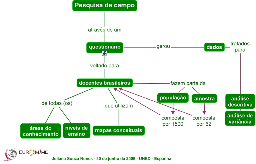 Esse mapa conceitual, produzido no IHMC CmapTools, tem a informação relacionada a: apres8 pesq campo, questionário voltado para docentes brasileiros, população composta por 1500 docentes brasileiros, docentes brasileiros fazem parte da população, docentes brasileiros de todas (os) áreas do conhecimento, Pesquisa de campo através de um questionário, amostra composta por 62 docentes brasileiros, docentes brasileiros de todas (os) níveis de ensino, questionário gerou dados, docentes brasileiros que utilizam mapas conceituais, docentes brasileiros fazem parte da amostra, dados tratados para análise de variância, dados tratados para análise descritiva