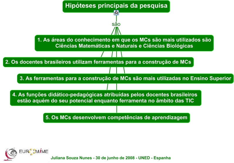 Esse mapa conceitual, produzido no IHMC CmapTools, tem a informação relacionada a: apres5 hipot princ, Hipóteses principais da pesquisa são 4. As funções didático-pedagógicas atribuídas pelos docentes brasileiros estão aquém do seu potencial enquanto ferramenta no âmbito das TIC, Hipóteses principais da pesquisa são 1. As áreas do conhecimento em que os MCs são mais utilizados são Ciências Matemáticas e Naturais e Ciências Biológicas, Hipóteses principais da pesquisa são 3. As ferramentas para a construção de MCs são mais utilizadas no Ensino Superior, Hipóteses principais da pesquisa são 5. Os MCs desenvolvem competências de aprendizagem, Hipóteses principais da pesquisa são 2. Os docentes brasileiros utilizam ferramentas para a construção de MCs