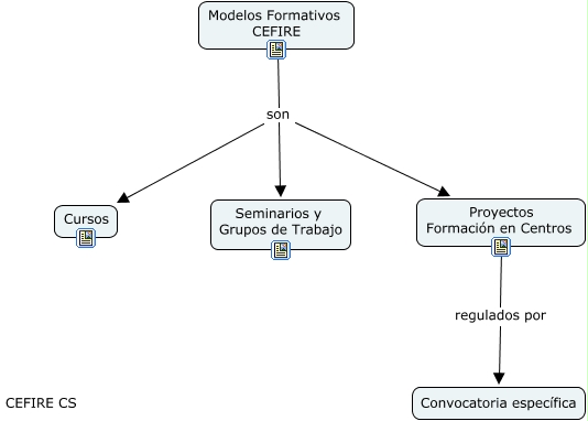 Este Cmap, tiene información relacionada con: Modelos formativos CEFIRE, Modelos Formativos CEFIRE son Seminarios y Grupos de Trabajo, Modelos Formativos CEFIRE son Proyectos Formación en Centros, Modelos Formativos CEFIRE son Cursos, Proyectos Formación en Centros regulados por Convocatoria específica