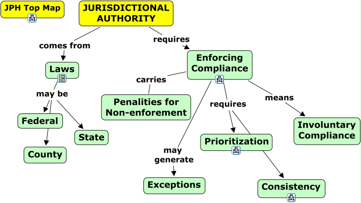 This Concept Map, created with IHMC CmapTools, has information related to: JCPH JURISDICTIONAL AUTHORITY 8.30.08, JURISDICTIONAL AUTHORITY requires Enforcing Compliance, Enforcing Compliance may generate Exceptions, Enforcing Compliance carries Penalities for Non-enforement, JURISDICTIONAL AUTHORITY comes from Laws, Laws may be County, Enforcing Compliance requires Prioritization, Enforcing Compliance means Involuntary Compliance, Enforcing Compliance requires Consistency, Laws may be State, Laws may be Federal