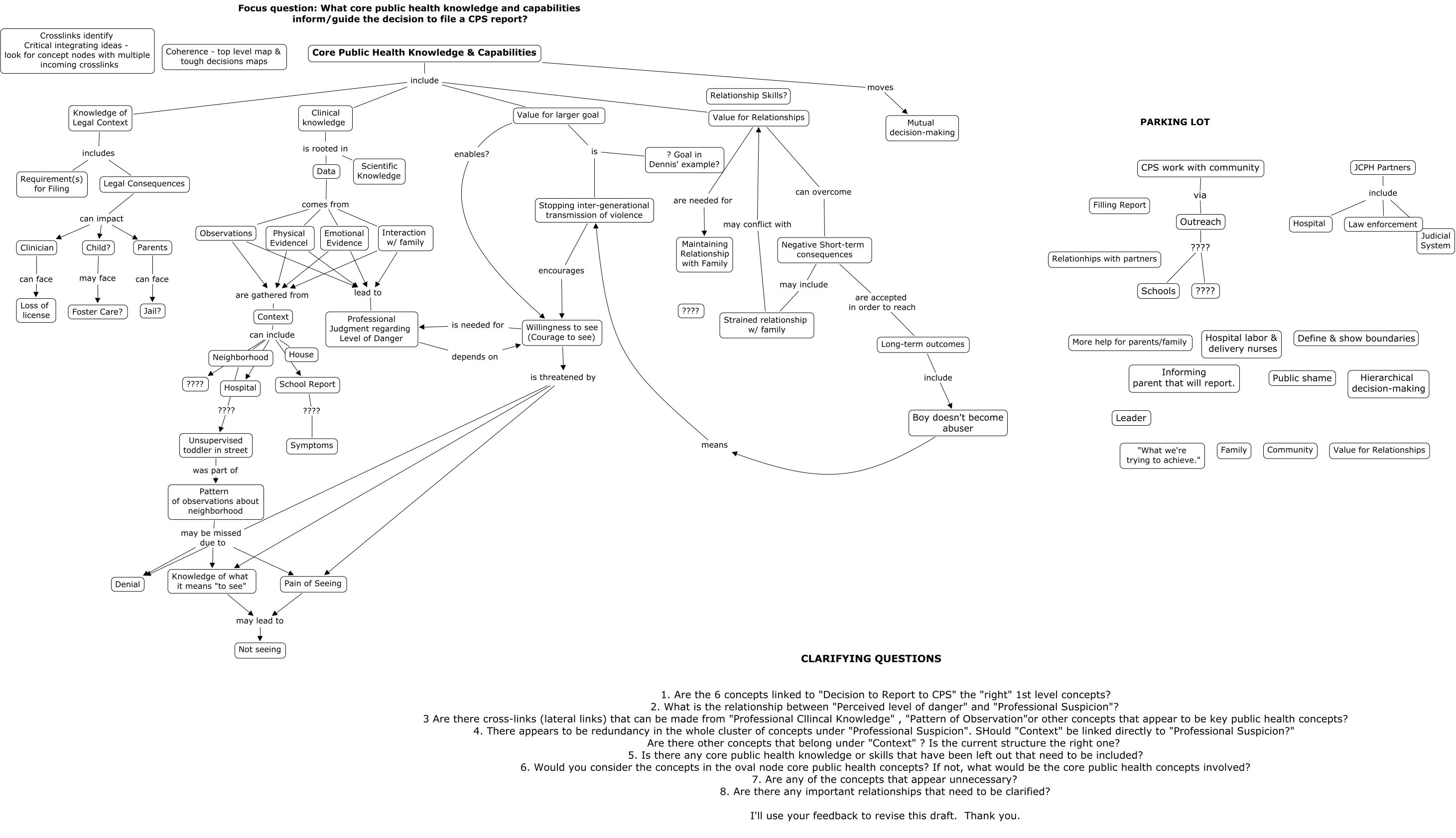 This Concept Map, created with IHMC CmapTools, has information related to: JCPH Child Protective Services Report Draft 6c autoformat, Value for Relationships are needed for Maintaining Relationship with Family, Core Public Health Knowledge & Capabilities moves Mutual decision-making, School Report ???? Symptoms, Physical Evidencel lead to Professional Judgment regarding Level of Danger, Negative Short-term consequences may include Strained relationship w/ family, Value for larger goal is Stopping inter-generational transmission of violence, Context can include Neighborhood, Core Public Health Knowledge & Capabilities include Clinical knowledge, Context can include ????, JCPH Partners include Judicial System, Knowledge of what it means "to see" may lead to Not seeing, Outreach ???? ????, Data comes from Physical Evidencel, Long-term outcomes include Boy doesn't become abuser, Clinician can face Loss of license, Child? may face Foster Care?, Interaction w/ family are gathered from Context, Parents can face Jail?, Core Public Health Knowledge & Capabilities include Value for Relationships, Context can include School Report