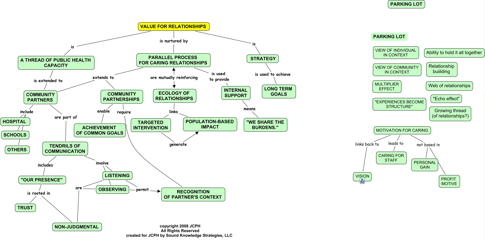This Concept Map, created with IHMC CmapTools, has information related to: JeffCo Public Health Value for Relationships hand out 7.30.08, OBSERVING are NON-JUDGMENTAL, COMMUNITY PARTNERSHIPS enable ACHIEVEMENT OF COMMON GOALS, PARALLEL PROCESS FOR CARING RELATIONSHIPS is used to provide INTERNAL SUPPORT, "OUR PRESENCE" is rooted in NON-JUDGMENTAL, TENDRILS OF COMMUNICATION includes "OUR PRESENCE", MOTIVATION FOR CARING not based in PROFIT MOTIVE, COMMUNITY PARTNERS are part of TENDRILS OF COMMUNICATION, "OUR PRESENCE" is rooted in TRUST, MOTIVATION FOR CARING links back to VISION, A THREAD OF PUBLIC HEALTH CAPACITY is extended to COMMUNITY PARTNERS, VALUE FOR RELATIONSHIPS is STRATEGY, MOTIVATION FOR CARING leads to CARING FOR STAFF, PARALLEL PROCESS FOR CARING RELATIONSHIPS extends to COMMUNITY PARTNERSHIPS, TENDRILS OF COMMUNICATION involve OBSERVING, COMMUNITY PARTNERS include SCHOOLS, TENDRILS OF COMMUNICATION involve LISTENING, MOTIVATION FOR CARING not based in PERSONAL GAIN, INTERNAL SUPPORT means "WE SHARE THE BURDENS.", OBSERVING permit RECOGNITION OF PARTNER'S CONTEXT, VALUE FOR RELATIONSHIPS is A THREAD OF PUBLIC HEALTH CAPACITY
