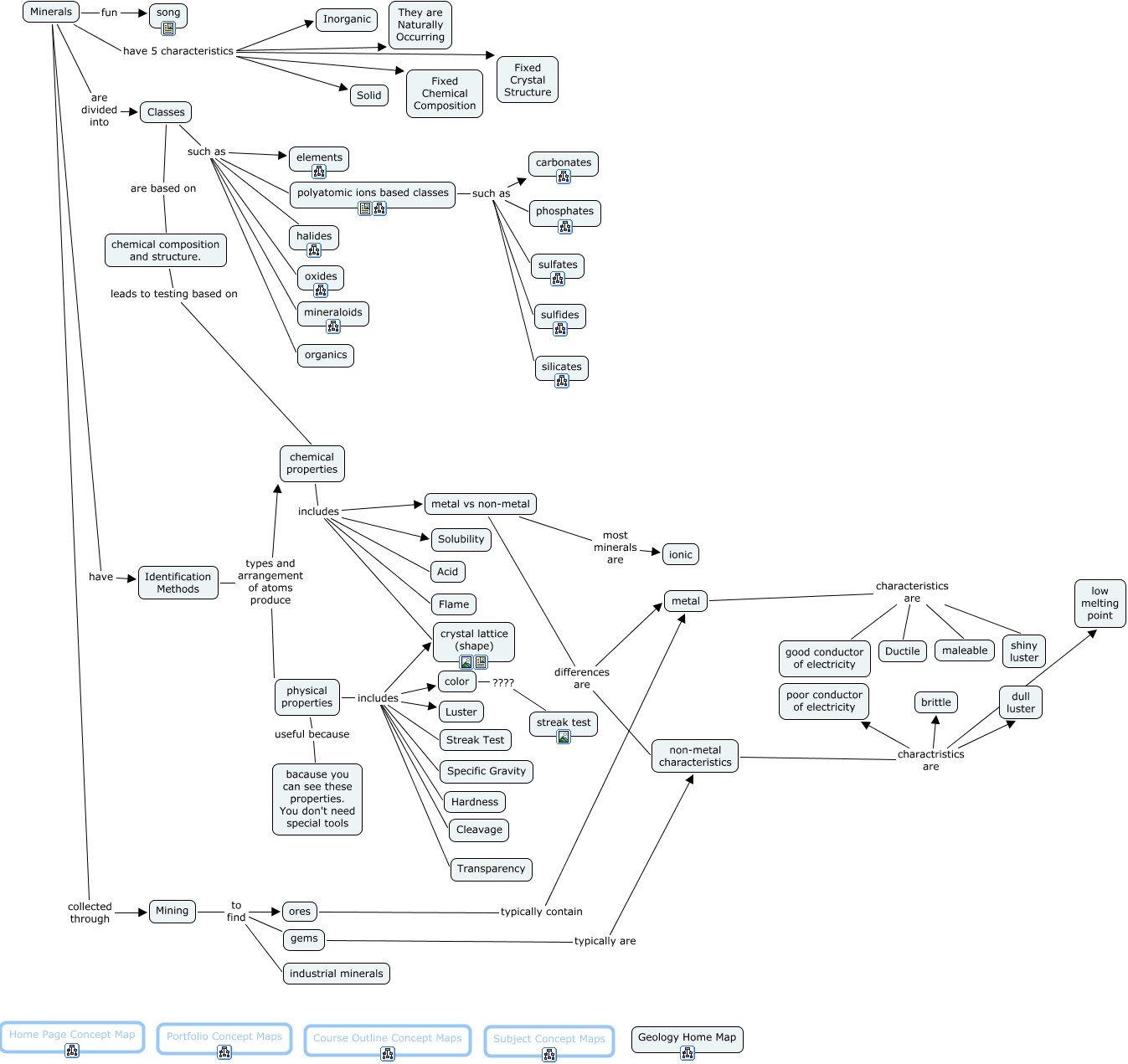 This Concept Map, created with IHMC CmapTools, has information related to: Minerals, Classes such as polyatomic ions based classes, Mining to find ores, Classes such as mineraloids, metal characteristics are maleable, physical properties includes Streak Test, metal characteristics are good conductor of electricity, ores typically contain metal, chemical properties includes Acid, metal characteristics are shiny luster, Minerals have 5 characteristics Fixed Chemical Composition, chemical properties includes Solubility, polyatomic ions based classes such as sulfides, physical properties includes Cleavage, Minerals have 5 characteristics Solid, physical properties includes Hardness, physical properties includes Specific Gravity, Minerals are divided into Classes, Classes such as elements, chemical composition and structure. leads to testing based on chemical properties, Mining to find gems