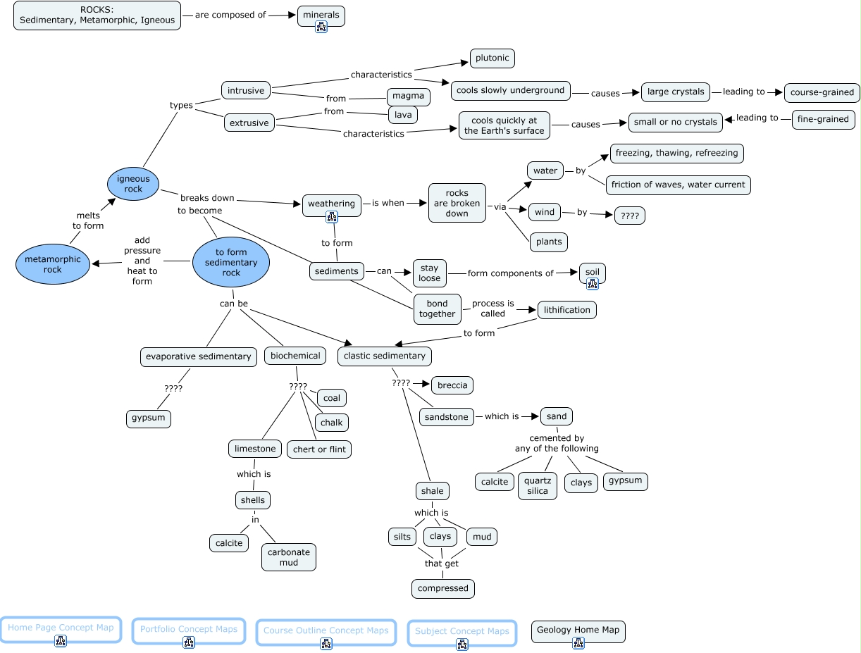 This Concept Map, created with IHMC CmapTools, has information related to: Sedimentary_Igneous_Metamorphic, clastic sedimentary ???? shale, sand cemented by any of the following calcite, to form sedimentary rock can be biochemical, bond together process is called lithification, biochemical ???? chalk, sediments can bond together, shale which is silts, rocks are broken down via wind, biochemical ???? limestone, evaporative sedimentary ???? gypsum, clastic sedimentary ???? breccia, silts that get compressed, intrusive types igneous rock, bond together to become to form sedimentary rock, limestone which is shells, shale which is clays, cools quickly at the Earth's surface causes small or no crystals, biochemical ???? coal, igneous rock breaks down weathering, weathering to form sediments