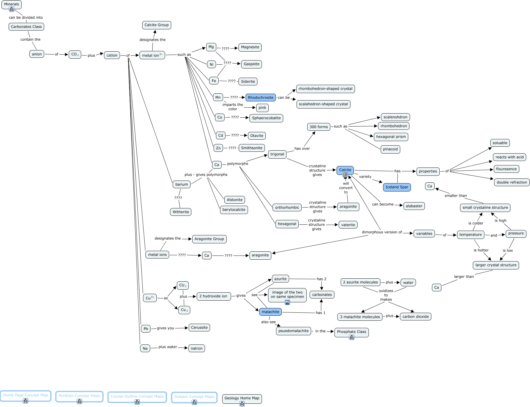 This Concept Map, created with IHMC CmapTools, has information related to: Carbonates, 2 azurite molecules plus water, small crystaline structure smaller than Ca, barium plus - gives polymorphs Alstonite, metal ions ???? Ca, <math xmlns="http://www.w3.org/1998/Math/MathML"> <mrow> <mmultiscripts> <mtext> metal ion </mtext> <none/> <mtext> 2+ </mtext> </mmultiscripts> </mrow> </math> such as Cd, trigonal has over 300 forms, properties of double refraction, hexagonal crystaline structure gives vaterite, aragonite will convert to Calcite, <math xmlns="http://www.w3.org/1998/Math/MathML"> <mrow> <mmultiscripts> <mtext> metal ion </mtext> <none/> <mtext> 2+ </mtext> </mmultiscripts> </mrow> </math> designates the Calcite Group, <math xmlns="http://www.w3.org/1998/Math/MathML"> <mrow> <mmultiscripts> <mtext> metal ion </mtext> <none/> <mtext> 2+ </mtext> </mmultiscripts> </mrow> </math> such as Mn, 2 hydroxide ion gives malachite, Ni ???? Gaspeite, properties of reacts with acid, cation of Pb, 300 forms such as hexagonal prism, <math xmlns="http://www.w3.org/1998/Math/MathML"> <mrow> <mmultiscripts> <mtext> metal ion </mtext> <none/> <mtext> 2+ </mtext> </mmultiscripts> </mrow> </math> such as Mg, Fe ???? Siderite, trigonal crystaline structure gives Calcite, Mg ???? Gaspeite