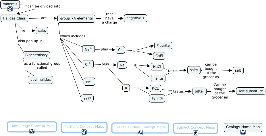 This Concept Map, created with IHMC CmapTools, has information related to: Halide Class, Biochemistry as a functional group called acyl halides, Halides Class are salts, Halides Class also pop up in Biochemistry, sylvite tastes bitter, Halides Class are group 7A elements, group 7A elements which includes ????, K is sylvite, group 7A elements which includes <math xmlns="http://www.w3.org/1998/Math/MathML"> <mrow> <mmultiscripts> <mtext> Br </mtext> <none/> <mtext> 1- </mtext> </mmultiscripts> </mrow> </math>, Na is halite, minerals can be divided into Halides Class, group 7A elements that have a charge negative 1, halite tastes salty, <math xmlns="http://www.w3.org/1998/Math/MathML"> <mrow> <mmultiscripts> <mtext> Cl </mtext> <none/> <mtext> 1- </mtext> </mmultiscripts> </mrow> </math> plus Na, group 7A elements which includes <math xmlns="http://www.w3.org/1998/Math/MathML"> <mrow> <mmultiscripts> <mtext> Cl </mtext> <none/> <mtext> 1- </mtext> </mmultiscripts> </mrow> </math>, Ca is Flourite, group 7A elements which includes <math xmlns="http://www.w3.org/1998/Math/MathML"> <mrow> <mmultiscripts> <mtext> Na </mtext> <none/> <mtext> 1- </mtext> </mmultiscripts> </mrow> </math>, <math xmlns="http://www.w3.org/1998/Math/MathML"> <mrow> <mmultiscripts> <mtext> Na </mtext> <none/> <mtext> 1- </mtext> </mmultiscripts> </mrow> </math> plus Ca, NaCl tastes salty, KCL tastes bitter, K is KCL