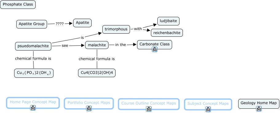 This Concept Map, created with IHMC CmapTools, has information related to: Phosphate Class, malachite chemical formula is Cu4(CO3)2(OH)4, malachite in the Carbonate Class, psuedomalachite see malachite, trimorphous with ludjibaite, psuedomalachite is trimorphous, trimorphous with reichenbachite, Apatite Group ???? Apatite, psuedomalachite chemical formula is <math xmlns="http://www.w3.org/1998/Math/MathML"> <mrow> <mmultiscripts> <mtext> Cu </mtext> <mtext> 5 </mtext> <none/> </mmultiscripts> <mtext> ( </mtext> <mmultiscripts> <mtext> PO </mtext> <mtext> 4 </mtext> <none/> </mmultiscripts> <mtext> )2 </mtext> <mmultiscripts> <mtext> (OH </mtext> <mtext> 4 </mtext> <none/> </mmultiscripts> <mtext> ) </mtext> </mrow> </math>