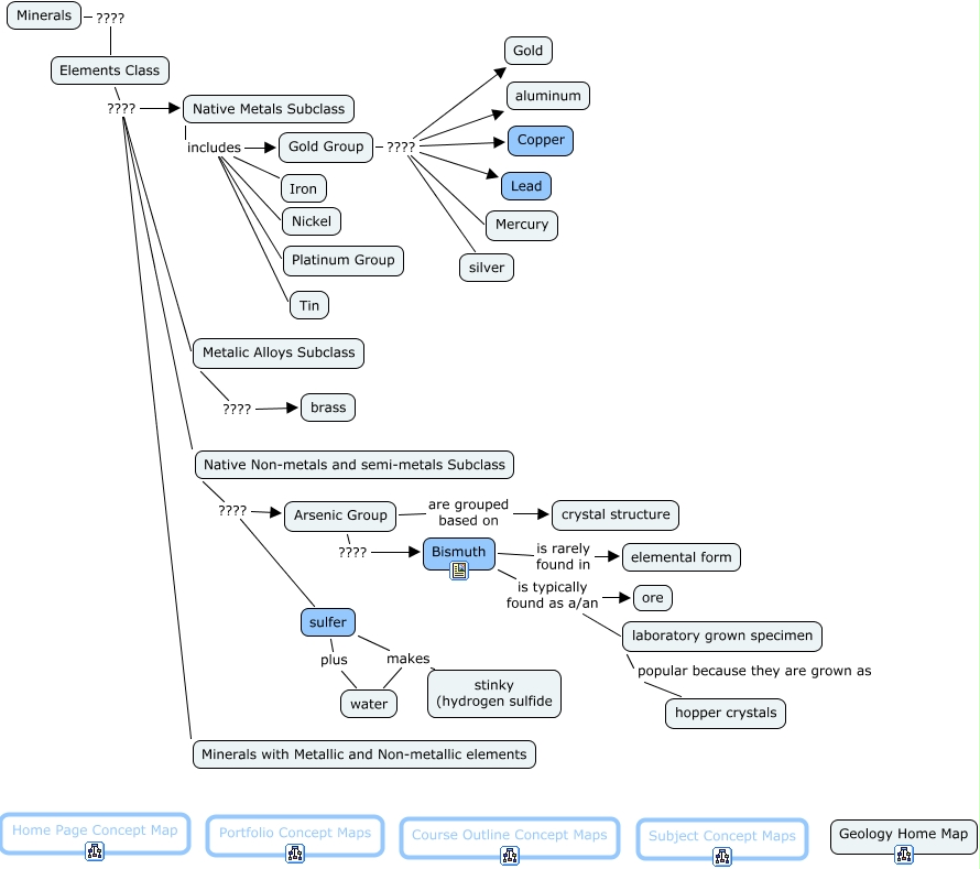 This Concept Map, created with IHMC CmapTools, has information related to: Elements Class, Metalic Alloys Subclass ???? brass, Arsenic Group are grouped based on crystal structure, water makes stinky (hydrogen sulfide, Native Metals Subclass includes Platinum Group, Gold Group ???? Mercury, Minerals ???? Elements Class, Native Non-metals and semi-metals Subclass ???? Arsenic Group, Gold Group ???? silver, sulfer plus water, Gold Group ???? Copper, Elements Class ???? Native Non-metals and semi-metals Subclass, Native Metals Subclass includes Nickel, Elements Class ???? Minerals with Metallic and Non-metallic elements, sulfer makes stinky (hydrogen sulfide, Native Metals Subclass includes Tin, Gold Group ???? aluminum, Gold Group ???? Lead, Bismuth is typically found as a/an laboratory grown specimen, Gold Group ???? Gold, Bismuth is typically found as a/an ore