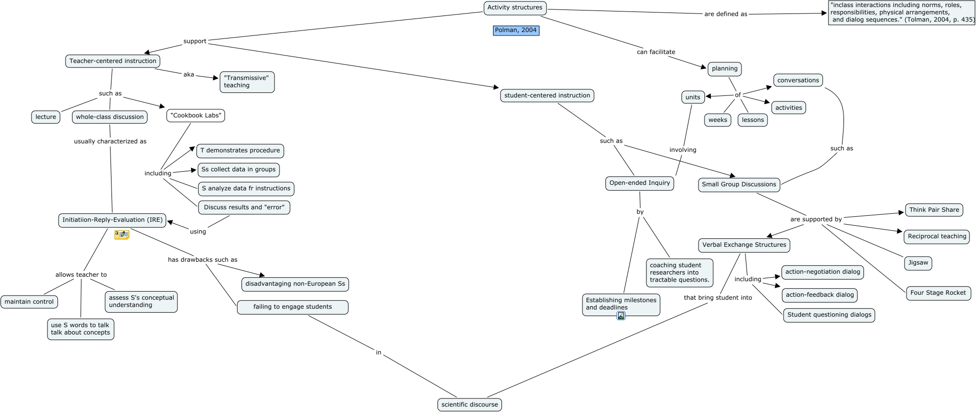 This Concept Map, created with IHMC CmapTools, has information related to: Science Ed Activity Structures, Open-ended Inquiry by Establishing milestones and deadlines, Small Group Discussions are supported by Four Stage Rocket, Initiatiion-Reply-Evaluation (IRE) has drawbacks such as disadvantaging non-European Ss, failing to engage students in scientific discourse, planning of units, "Cookbook Labs" including Discuss results and "error", planning of conversations, Discuss results and "error" using Initiatiion-Reply-Evaluation (IRE), Teacher-centered instruction such as "Cookbook Labs", Open-ended Inquiry by coaching student researchers into tractable questions., Teacher-centered instruction aka "Transmissive" teaching, Small Group Discussions are supported by Reciprocal teaching, Activity structures support Teacher-centered instruction, Verbal Exchange Structures including action-negotiation dialog, Small Group Discussions are supported by Think Pair Share, conversations such as Small Group Discussions, Initiatiion-Reply-Evaluation (IRE) allows teacher to maintain control, Teacher-centered instruction such as lecture, "Cookbook Labs" including Ss collect data in groups, "Cookbook Labs" including T demonstrates procedure